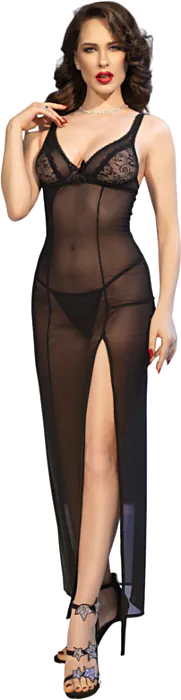 Elegante babydoll lungo in pizzo trasparente che avvolge delicatamente il corpo, offrendo un comfort senza pari. Completo di tanga abbinato per un look raffinato.
