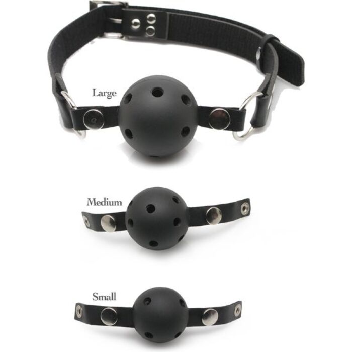 Cada bola es intercambiable con los broches de presión, fabricada de plástico no tóxico y equipado con agujeros para facilitar la respiración. La correa resistente de cuero negro se ajusta fácilmente para adaptarse a la mayoría de los tamaños.
