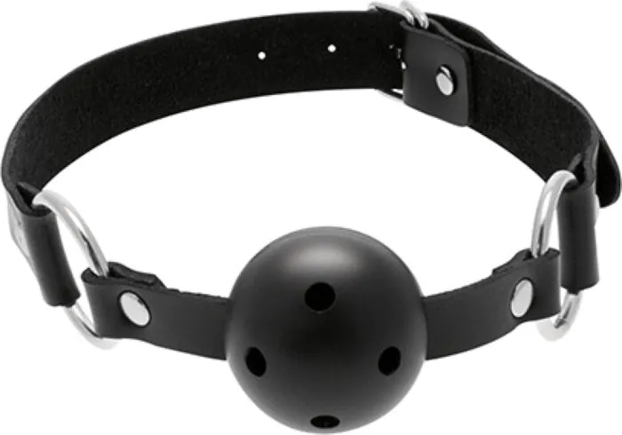 Ti spiego: questo è un bavaglio a palla ventilato pensato per chi pratica BDSM e vuole un accessorio che non ostacoli la respirazione. La sfera in gomma presenta aperture che facilitano il respiro e rendono la morza meno claustrofobica rispetto a una palla piena; le ringhiere metalliche collegano la palla a una cinghia in cuoio che si chiude con fibbia e si regola facilmente attorno al collo.