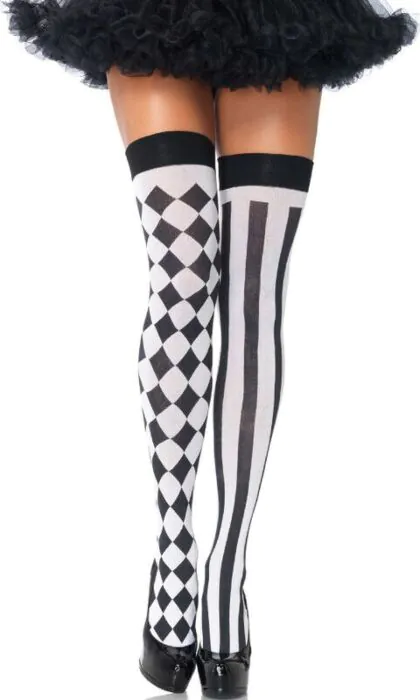 Un design accattivante che esprime personalità e stile. Le calze alte di Leg Avenue presentano un vivace motivo a rombi in bianco e nero, consigliato per chi desidera farsi notare. Realizzate in 100% nylon, offrono un comfort eccezionale e una vestibilità elastica che si adatta a diverse forme e taglie.