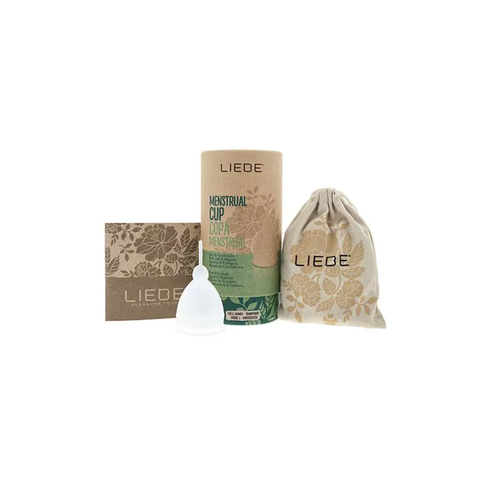Coppetta mestruale Liebe in silicone medicale, taglia Large pensata per chi ha flusso moderato o abbondante. Capacità 30 ml e utilizzo fino a 12 ore a seconda del flusso; indicata per donne sopra i 30 anni o per chi ha avuto parto vaginale. Riutilizzabile, si sterilizza in acqua bollente e si conserva nella sua sacchetta di cotone, con una vita utile fino a 15 anni.