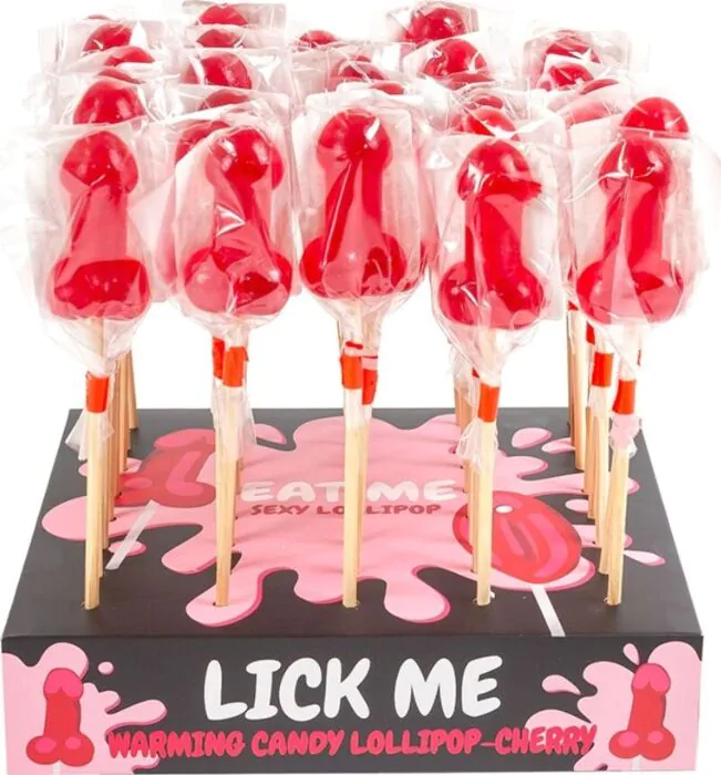 Piruleta commestibile a forma di pene di SECRETPLAY COSMETIC: caramella da 25 g al gusto ciliegia con effetto riscaldante piccante. Perfetta per addii al nubilato, scherzi tra adulti e momenti di gioco in coppia; è un oggetto di goliardia legato al mondo del giocattolo erotico, non un sex toy riutilizzabile. Tenere lontano dai bambini e da chi evita coloranti o zuccheri elevati.