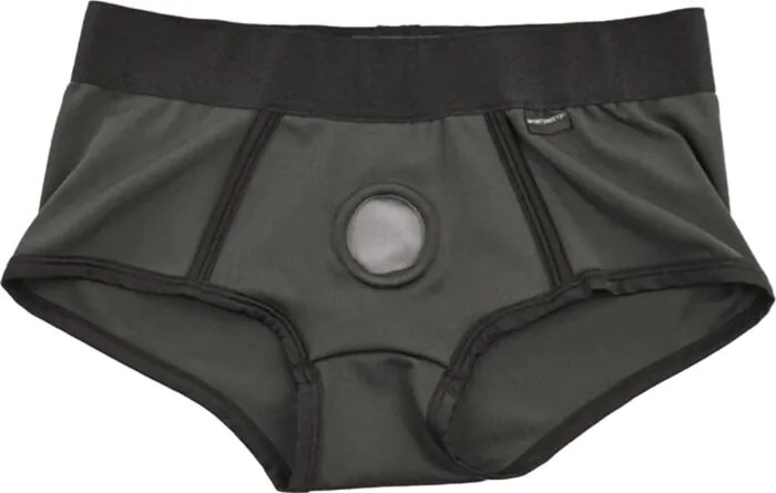 Imbracatura stile boxer Sportsheets pensata per chi cerca comfort e discrezione ogni giorno. Tessuto elastico e fascia in vita garantiscono una calzata salda; l'anello da 38,1 mm è compatibile con molti dildo standard e le due tasche per baliette aggiungono opzioni di stimolazione. Perfetta per chi vuole un harness morbido e portabile sotto gli abiti.