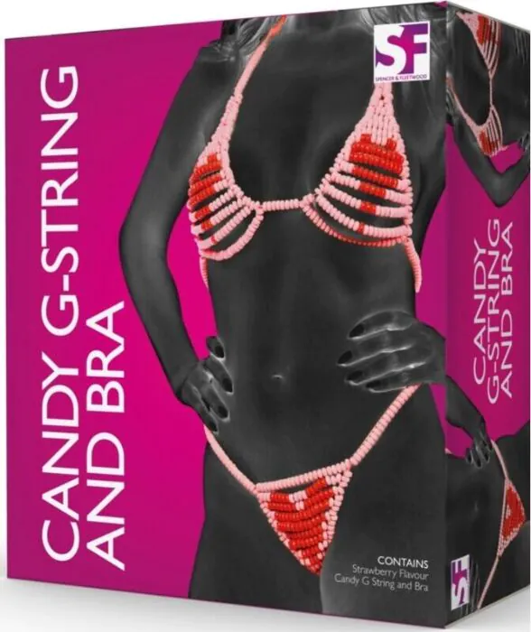 Seducente completo di reggiseno e tanga fatto di caramelle colorate e comestibili. Perfetto per chi cerca dolcezza e un tocco di audacia.