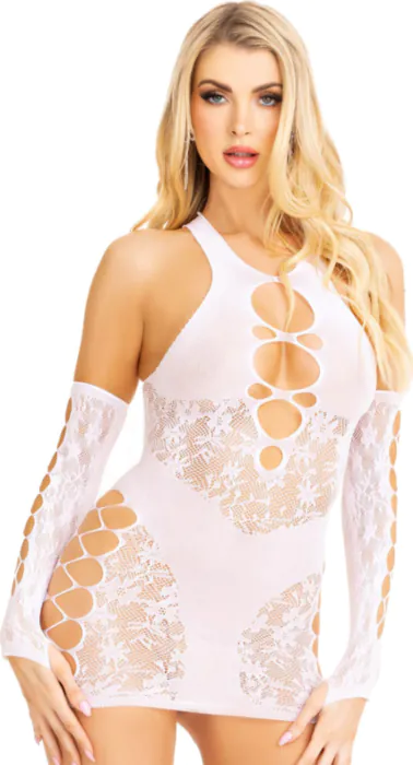 Minivestito di pizzo con guanti coordinati per accendere la passione. Consigliato per chi ama sedurre con stile e comfort.