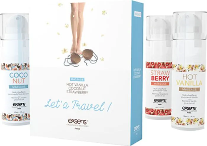 Kit di viaggio con 3 oli da massaggio comestibili, effetto caldo. Consigliato per chi cerca nuove esperienze sensoriali e momenti di intimità.