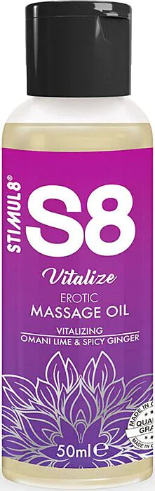 Olio da massaggio S8 Vitalize di STIMUL8: miscela di jojoba, mandorla e sesamo arricchita con vitamine e minerali, profumazione lime e zenzero. Bottiglia compatta da 50 ml pensata per coppie e massaggi intimi; nutre la pelle lasciandola morbida. Ottimo per rituali sensoriali, meno indicato se usi preservativi in lattice o giocattoli in silicone.