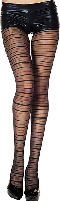 Ti do l'opinione che darei in negozio: questo è un panty nero con righe orizzontali firmato Music Legs, pensato per valorizzare il look dell'intimo senza risultare eccessivo. È un capo d'effetto che punta sull'estetica—le righe orizzontali danno carattere e un tocco grafico al tuo completo.