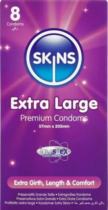 I preservativi Skins XL hanno una lunghezza di 205 mm e una circonferenza di 57 mm, progettati per offrire una vestibilità più generosa.