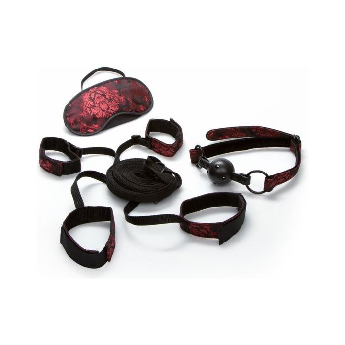 Kit de mordaza de lujo con bola transpirable y máscara con correa de fijación ajustable. Suave y acolchada por un lado y con tela de diseño en el otro.