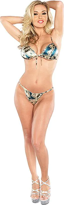 Ti spiego questo completo come farei in negozio: è un set di lingerie due pezzi composto da reggiseno senza ferretti e una string coordinata, caratterizzato da una stampa di banconote in tonalità verdi. Il punto di forza è il motivo grafico, pensato per chi vuole un capo giocoso e d'impatto nel proprio armadio intimo o nel tuo negozio erotico online.
