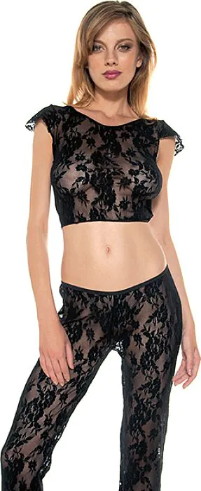 Set in pizzo composto da top con piccole maniche e pantaloni coordinati, firmato Music Legs. Pensato per chi cerca un capo intimo femminile e dalla vestibilità leggera, perfetto per serate intime o per un regalo curato. Sceglilo se apprezzi la sensualità del pizzo; non è indicato se cerchi sostegno strutturato o capi per uso quotidiano molto intenso.