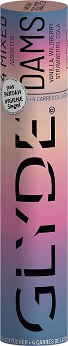 Protezione orale elegante con le barriere Glyde, realizzate in lattice di caucho naturale. Ogni pack contiene quattro varianti di sapore: vaniglia, frutti di bosco, cola e fragola. Con una dimensione di 250 mm x 150 mm e uno spessore di 80 micron, queste barriere sono sottili e facili da usare, offrendo una sensazione naturale durante l'uso.