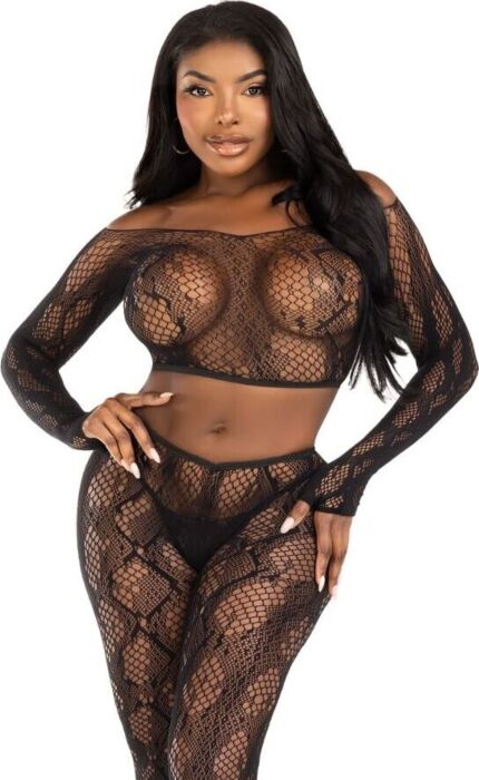 Osserva come tutti gli occhi si fermano su di te con questo audace completo in pizzo e rete elastica dal motivo di pelle di serpente. La combinazione di un crop top con maniche lunghe e leggings a vita alta abbraccia delicatamente la tua silhouette, creando un look provocante e irresistibile. Realizzato con un tessuto ultra morbido composto da 95% nylon e 5% elastan, offre la giusta elasticità per un comfort ottimale.