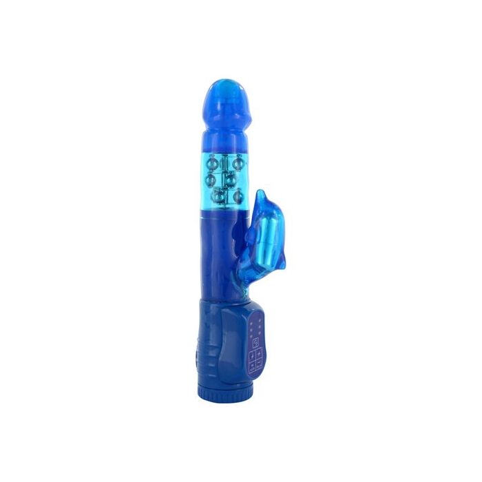 Estimulador de clítoris... perlas giratorias... estamos hablando de un vibrador de alta tecnología llamado Twinturbo Dolphin Vibrator Blue, está fabricado en  gelatina de alta calidad en color azul cristal y además de la incorporación del estimulador de clítoris y las perlas giratorias, también cuenta con el movimiento de su  cabeza que  gira sobre sí misma en ambas direcciones.